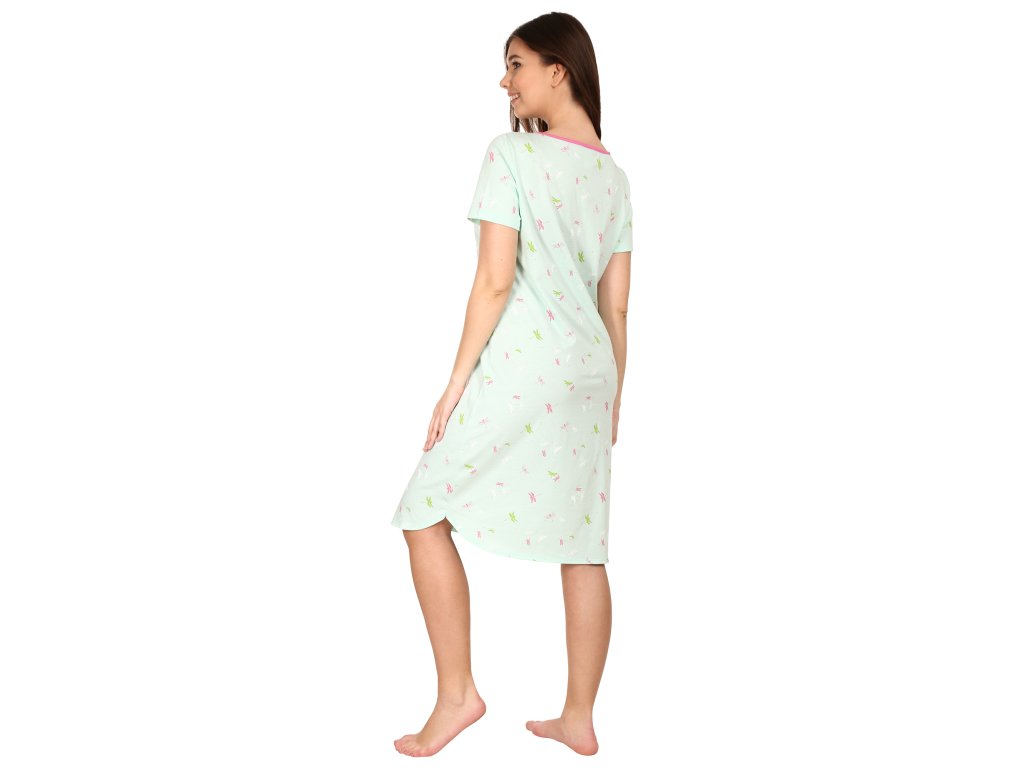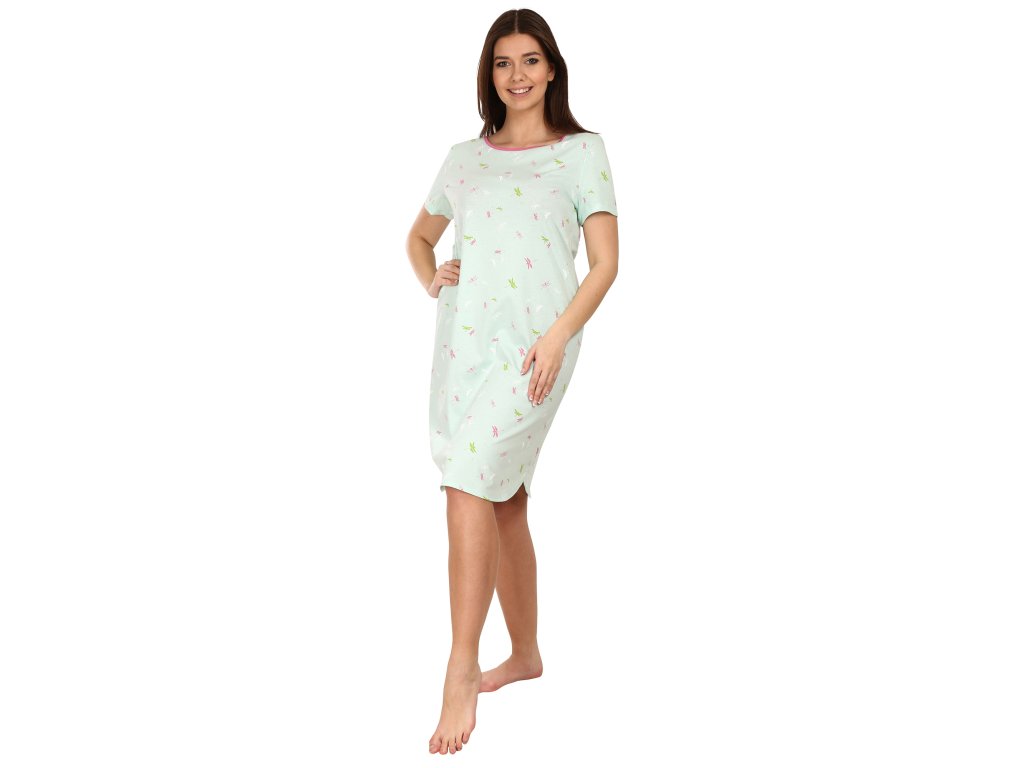 Bavlněná klasická noční košile s krátkým rukávem. Košile má kulatý výstřih s kontrastním lemováním. Spodní zakulacený okraj. Jemný jarní design.
