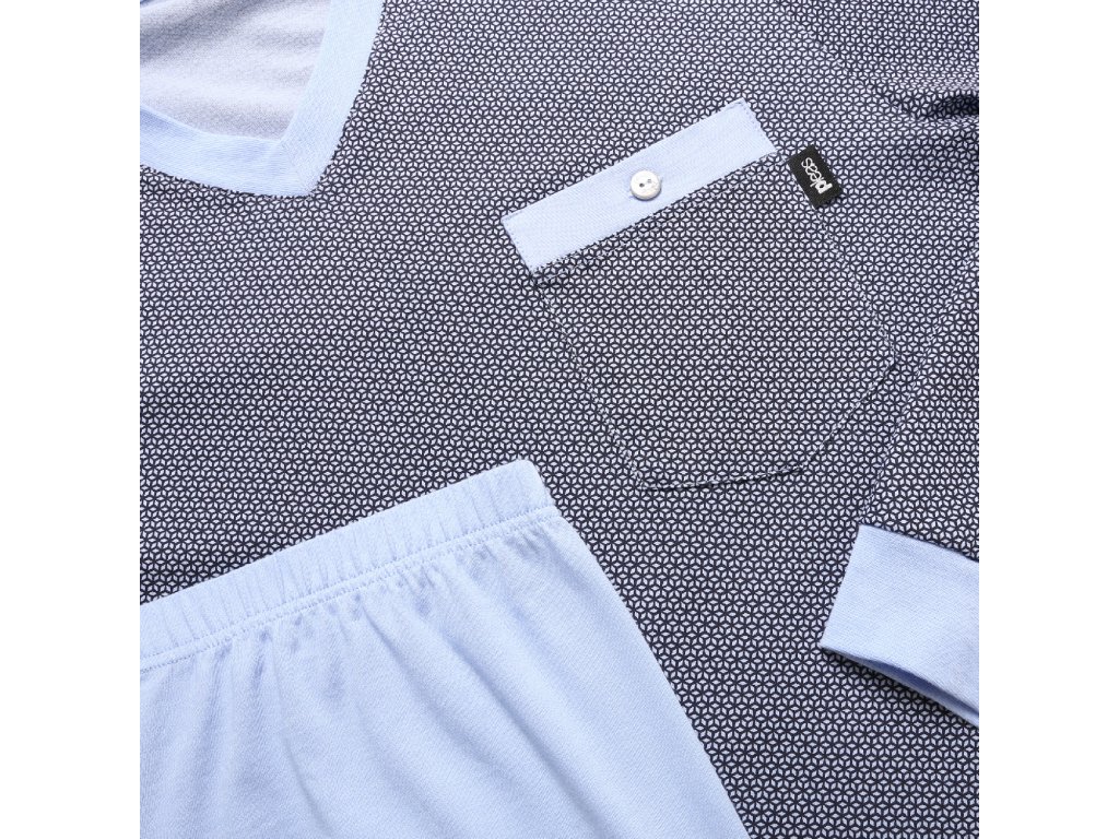 Pánské dlouhé pyžamo kvalitní materiálem i střihem české značky Pleas. Zakončení rukávů i nohavic jsou do nápletu. Kulatý výstřih, kalhoty mají v pase gumu.