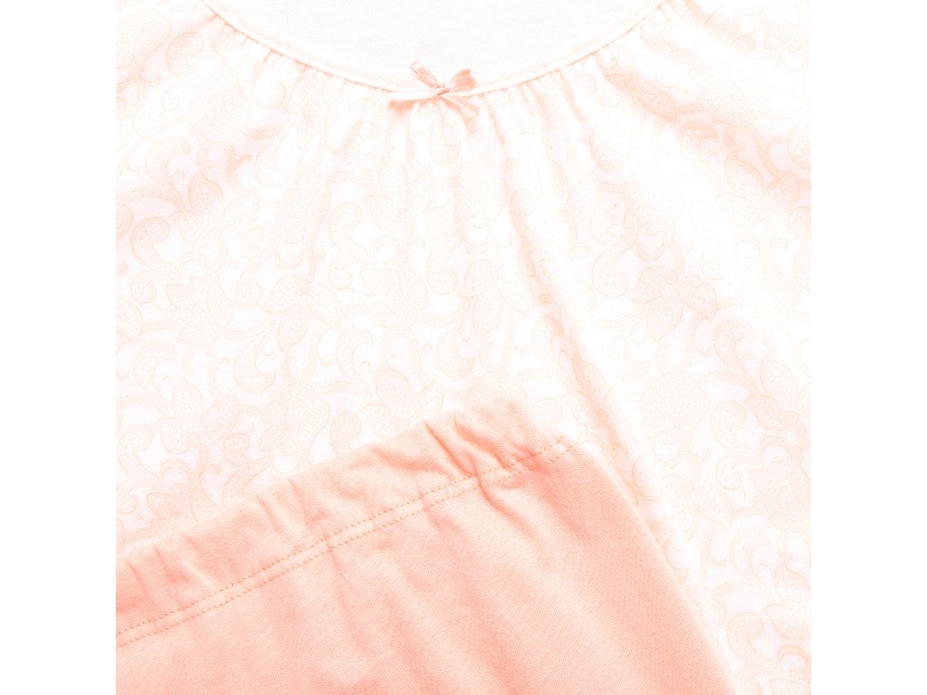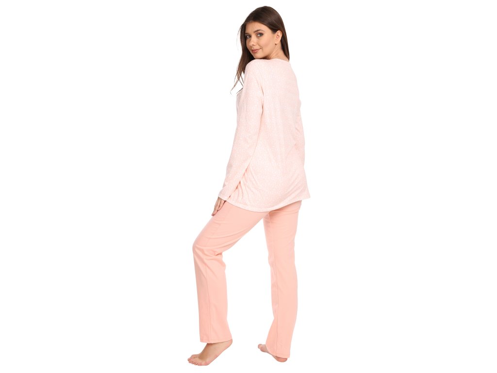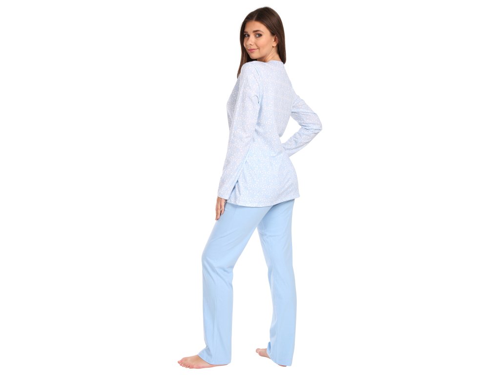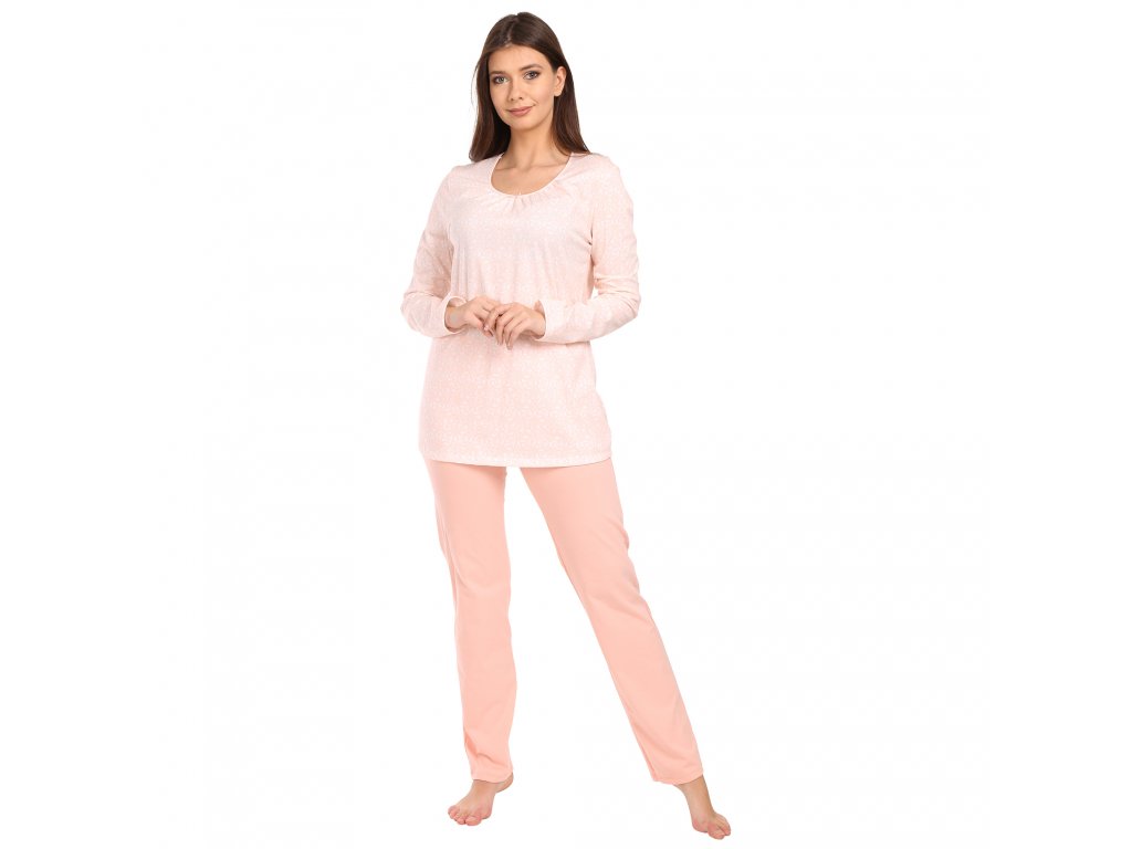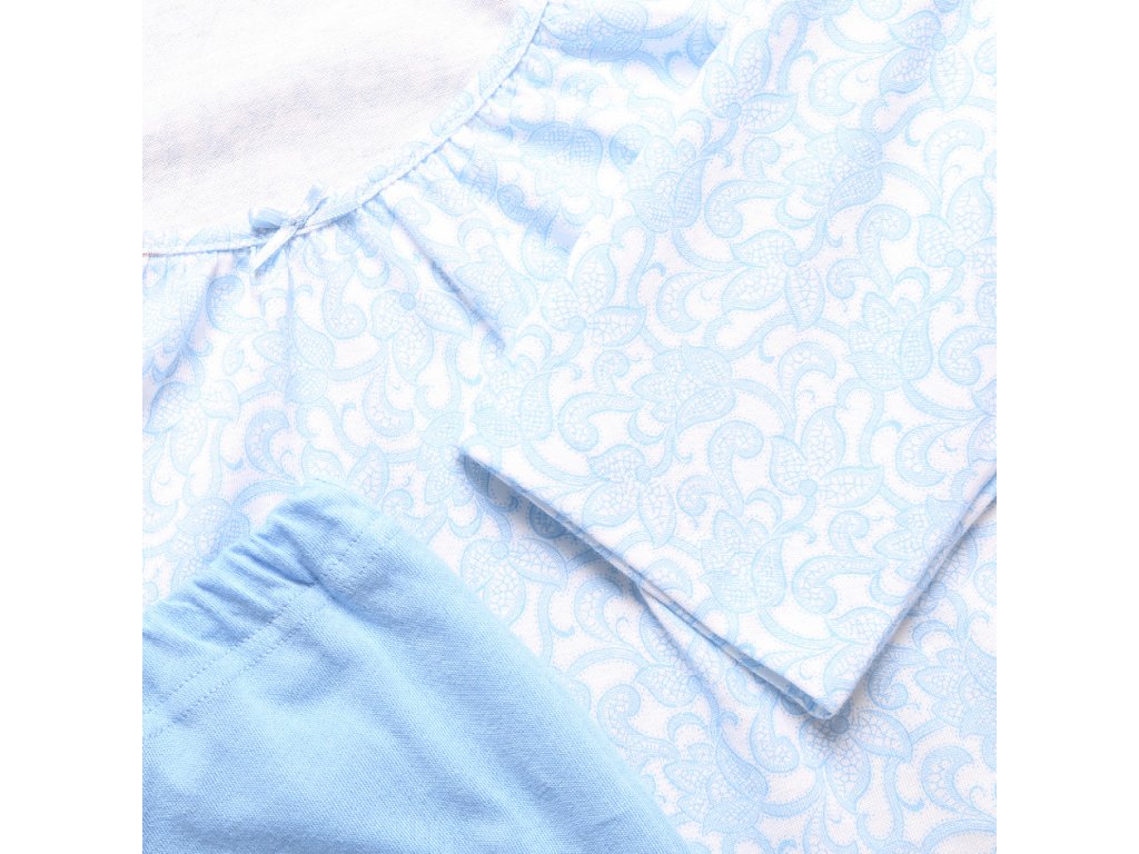 Pyžamo pohodlné díky střihu a materiálu. Vrchní díl pyžama je triko s dlouhým rukávem, vzorované, s kulatým výstřihem a jemným nabíráním. Spodní jednobarevné kalhoty jsou v dlouhé délce zakončeny rovně. Kalhoty mají v pase všitou gumu a tunýlek se šňůrkou na stažení.