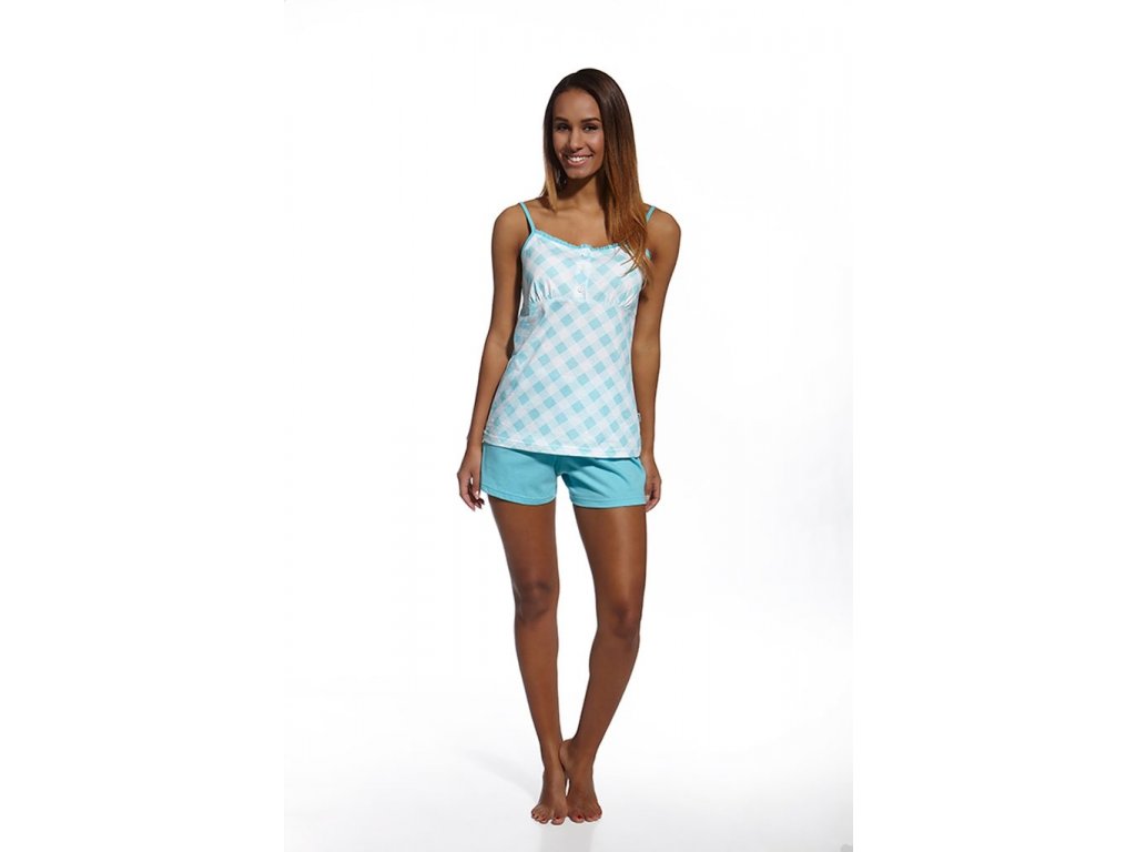 Velmi pohodlné pyžamko z kvalitní bavlny. Vrchní díl pyžamko je na úzká posuvná ramínka. Výstřih zdobí jemný volánek a krátká knoflíková léga. Spodní díl jsou šortky.